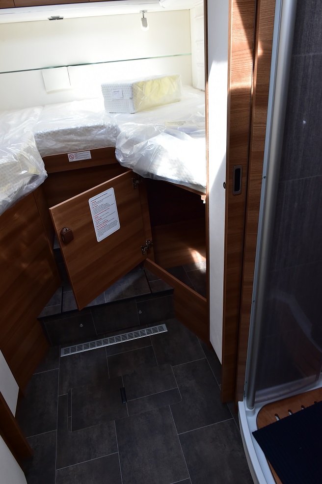 Planlösning med två längsgående enkelsängar bak. Undertill finns ett stort bagage med dubbla lastluckor. Under fotändan på respektive sida finns en halvgarderob samt två smala fullhöjdsgarderober. På ena sidan finns ett separat duschutrymme och på motsatt sida toalettutrymme. Dörren till bakre delen går att använda till att dela av wc/dusch samt en skjutdörr mot sängarna bak.