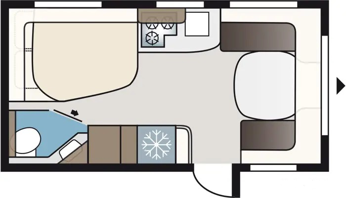 Planlösning med en längsgående dubbelsäng till vänster bak, bredvid ett rymlig toalettutrymme med dusch. Thetford kassett-wc. Stort förvaringsutrymme under den uppfällbara sängen. Överkast till sängen. En bred garderob och en smal garderob. Stort Kylskåp Dometic RMD85 med drift på 12volt/220volt eller gasol, med separat frysfack. Skåp undertill, vitrinskåp, tv-hållare. TV-antenn. Längsgående kök med gasolspis, vask med glaslock/lock samt gasolugn. Centrallåsning på lådorna.