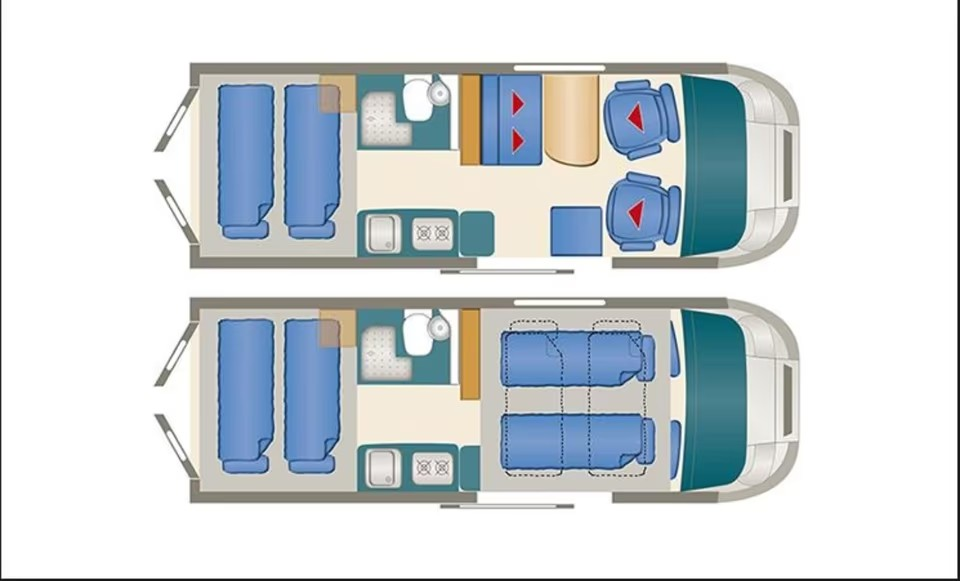 Planlösning med tvärgående dubbelsäng bak. Rymligt bagage och bra förvaringsskåp. På en sidan finns wc Thetford med dusch i kombination, vask vridbar. Fönster på toaletten. Trägaller på golv. På motsatt sida finns ett längsgående kök med 2-lågig gasolspis, vask och täcklock av glas. Uppfällbar förlängningsskiva. 12v Dometic kompressorkylskåp. Skjutdörr med elektriskt ingångssteg samt myggnätsdörr.