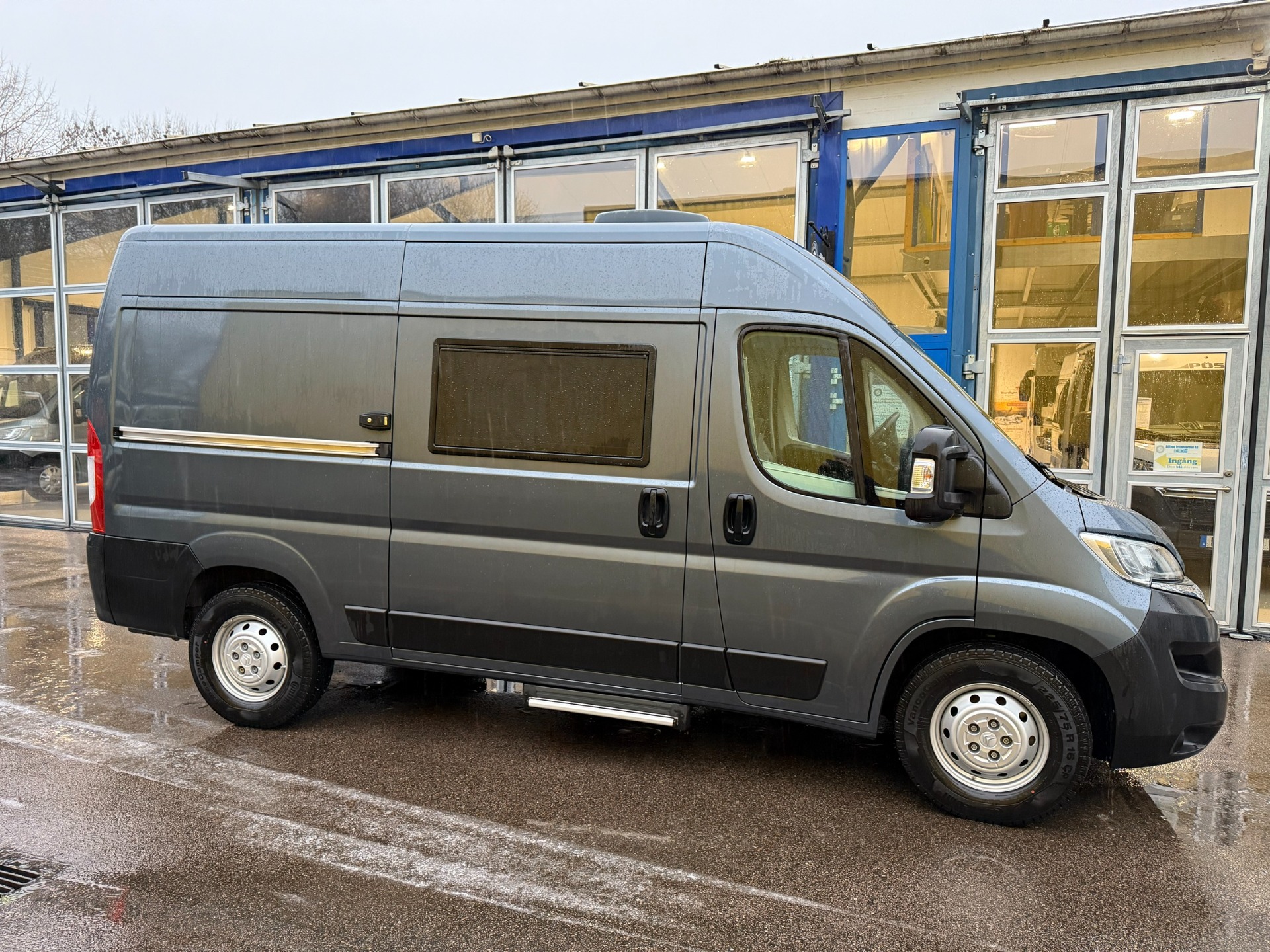 Plåtis byggd på Citroen Jumper chassi. Citroen 2,2hdi turbodiesel på 165hk. 6vxl manuell växellåda. Mätarställning ca 2560 mil. Euro 6d motor med grönt miljömärke. Citroen maxichassi med möjlig släpvagnsvik på 3000kg (Ingen krok på f.n.) A/C i förarhytten. Elektriska fönsterhissar. Elektriskt inställbara ytterspeglar. Elektriskt infällbara speglar. 2st airbags. Läderratt. Rattreglage. Farthållare. Däcktryckssensorer. Utvändig färg Mörk (eisengrau) grå metallic. 16" hjul. . Trädekor Mokka. Bodelsmiljö Grigio Lucente. Dubbeldin stereo Sony. I utförande med fyra bältade sittplatser. Multiroof hatthylla. Utförande utan dekaler. Servicedekal finns i motorrummet, service gjord 2025-02-08 vid mätarställning 14553km.