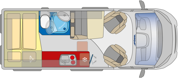 Planlösning med en tvärgående dubbelsäng baktill. Fönster i båda dörrarna bak samt på en långsidan. Gasolkoffert, vattentank och lastutrymme undertill. Framför denna finns vänstersida ett toalettutrymme i kombination med duschutrymme. Praktiskt utförande med svängbar duschvägg.