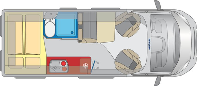 Planlösning med tvärgående dubbelsäng bak. Stort bagage undertill. Rymlig toalett i kombination med dusch. Fönster i toalettutrymmet. Dometic kassett-wc. Och på motsatt sida ett längsgående kök med vask, gasolspis med glaslock. Kompressorkylskåp med frysfack. Halvdinette sittgrupp med vändbara stolar i förarhytten. Stort takfönster. Myggnätsdörr. Elektriskt ingångssteg. Softlock stängning på skjutdörren.